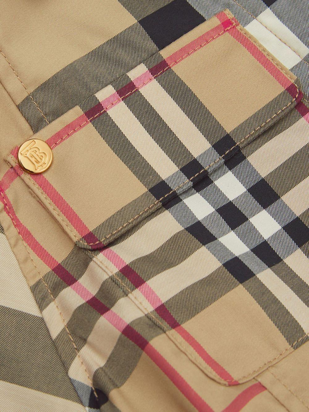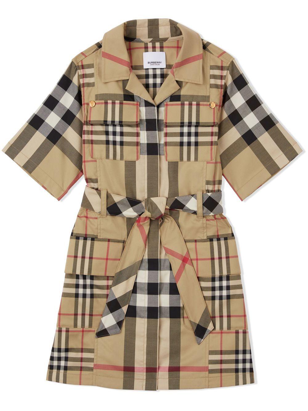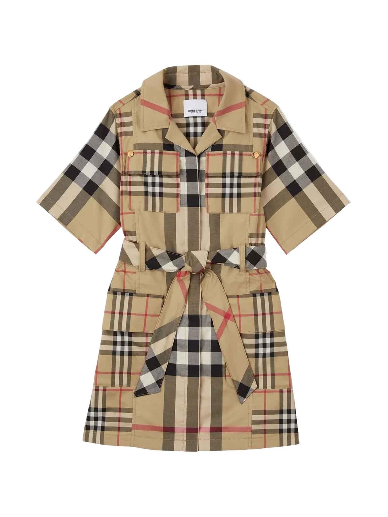 Abito beige bambina Burberry Kids. Motivo Vintage Check, design patchwork e dettaglio cintura. Cotone 95%, Spandex/Elastam 5%