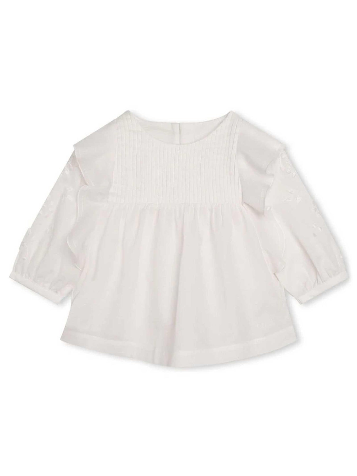 Blusa bianca neonata con ruches Chloè kidsDettaglio plissettato , traforato e chiusura posteriore con zip nascosta.