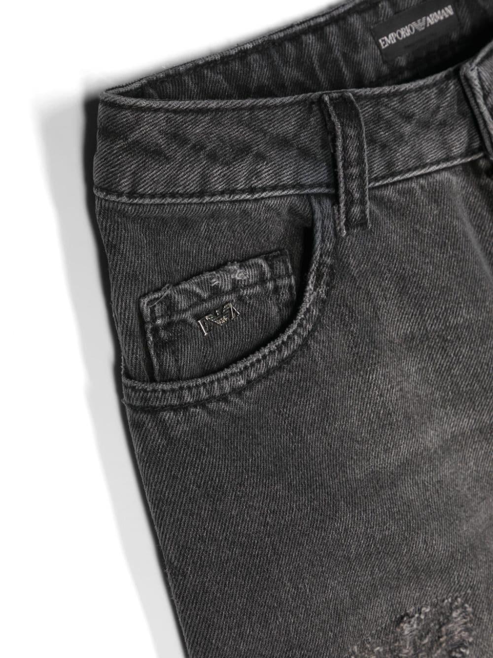 Jeans neri bambino Emporio Armani kids. Effetto sbiadito, chiusura frontale con bottoni e zip, design classico a cinque tasche e effetto vissuto. Cotone 100%