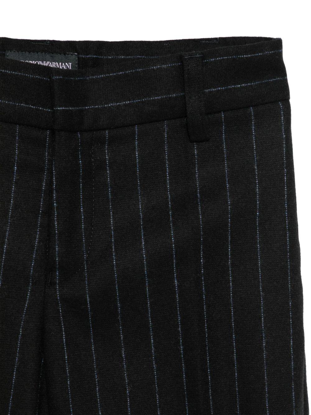 Completo blu bambino Emporio Armani Kids. Motivo gessato, blazer chiusura frontale con abbottonatura, revers classici, maniche lunghe, tasca applicata sul petto, logo ricamato, applicazione laterale con logo, doppio spacco posteriore e orlo dritto. Pantaloni chiusura nascosta frontale con bottone, gancio e zip, passanti, due tasche a filetto laterali, piega stirata, due tasche posteriori applicate e gamba affusolata. lana 65%, poliammide 29%, cashmere 5%, elastam 1%