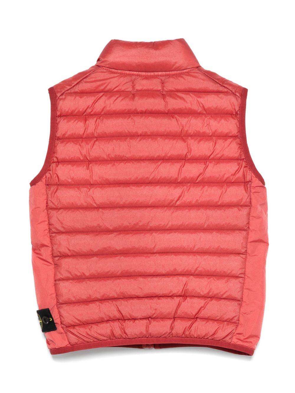 Gilet STONE ISLAND JUNIOR.Geranio,chiusura frontale con zip,due tasche laterali con zip,applicazione Compass.Esterno: resina poliuretanica 100%, nylon riciclato 100%Fodera: poliestere 100%, poliammide 100%, Piumino d'oca RDS 90%, piume d'anatra 10%