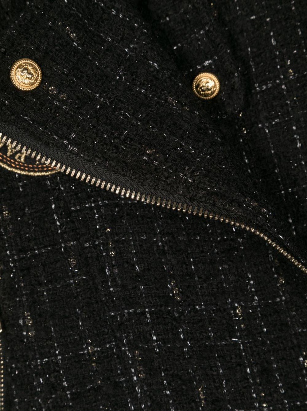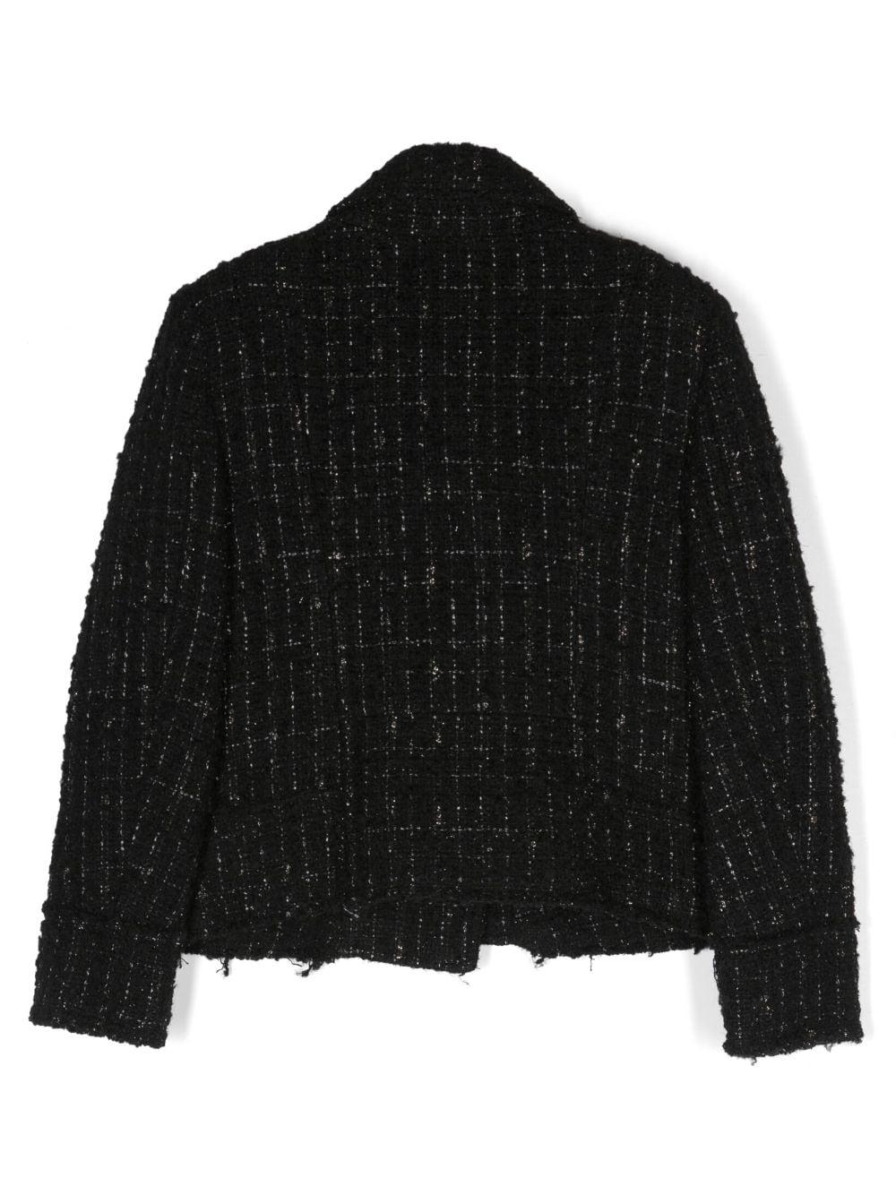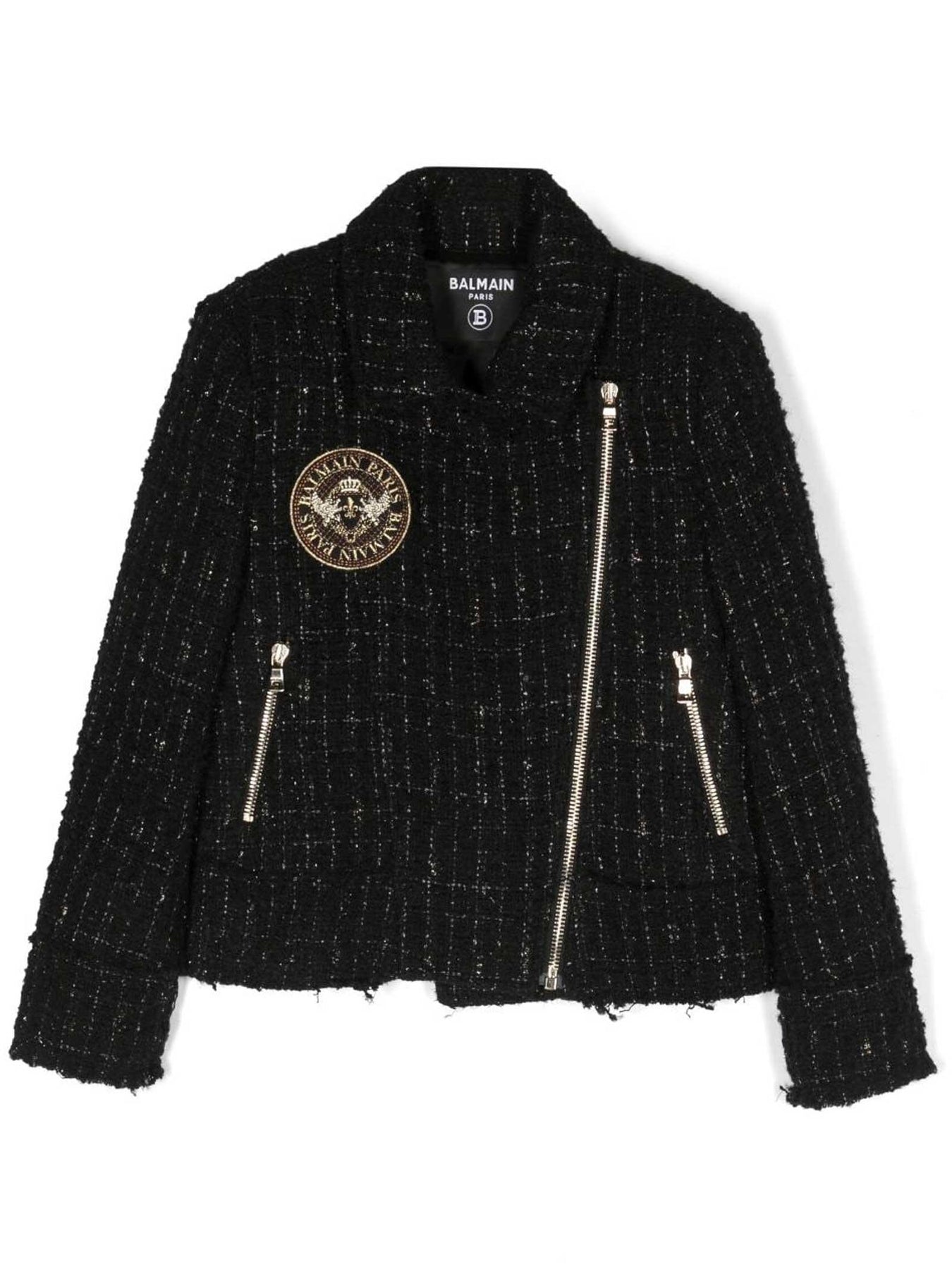 Giacca nera bambina con applicazione Balmain kidsNero, design lavorato a maglia, tweed, applicazione con logo sul petto, chiusura decentrata frontale con zip, tasche frontali con zip, colletto classico, maniche lunghe e orlo dritto.2%Acrylic 22%Cotton 15%Polyester 13%Wool 7%Polyamide 1%Metallizzata