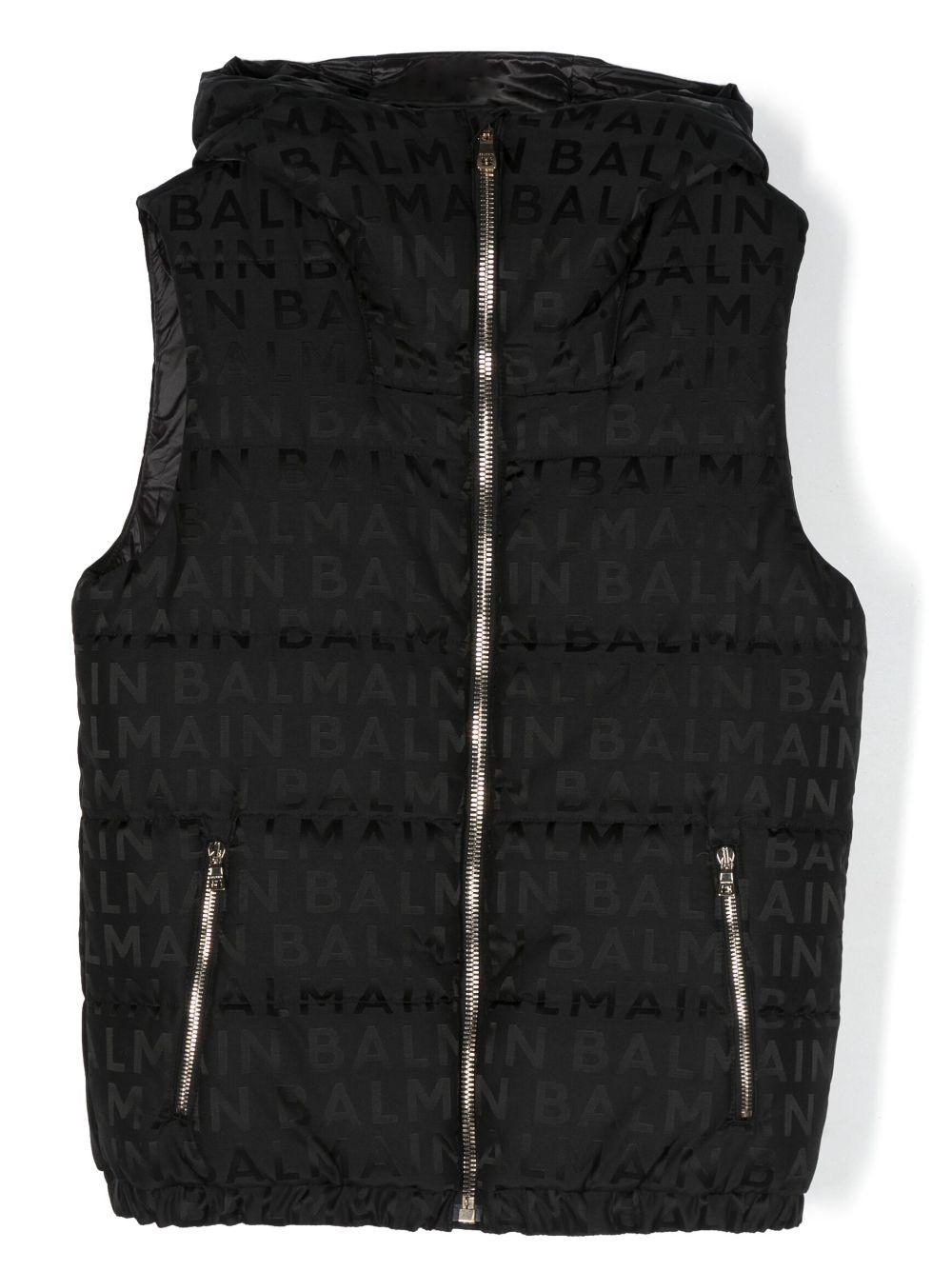 Gilet nero bambino con monogramma Balmain Kids, con cappuccio, senza maniche, chiusura frontale con zip, tasche frontali con zip, orlo dritto e orlo elasticizzato.ComposizioneEsterno: Poliammide 66%, Cotone 34%Fodera: Poliestere 100%, Poliammide 100%