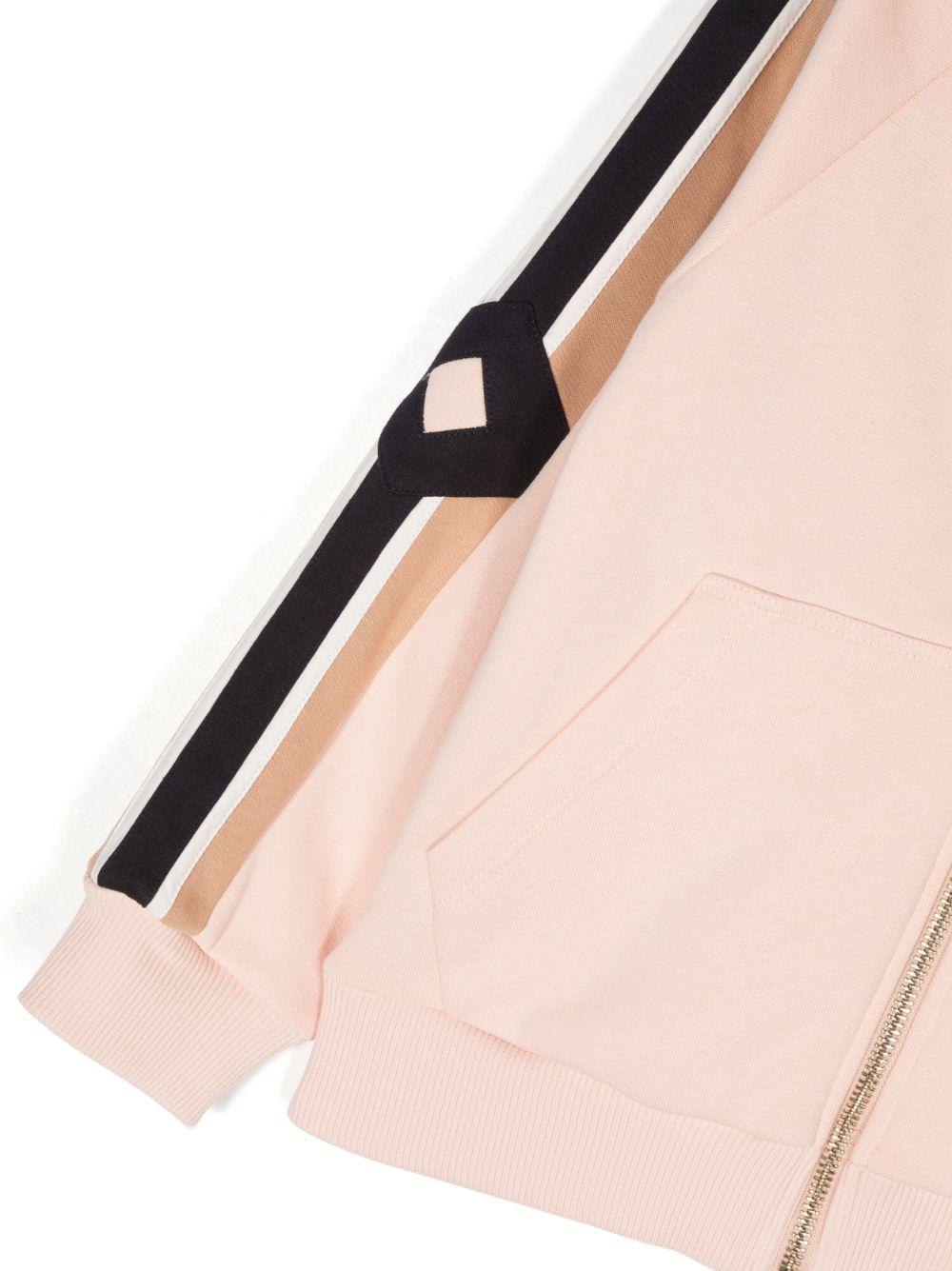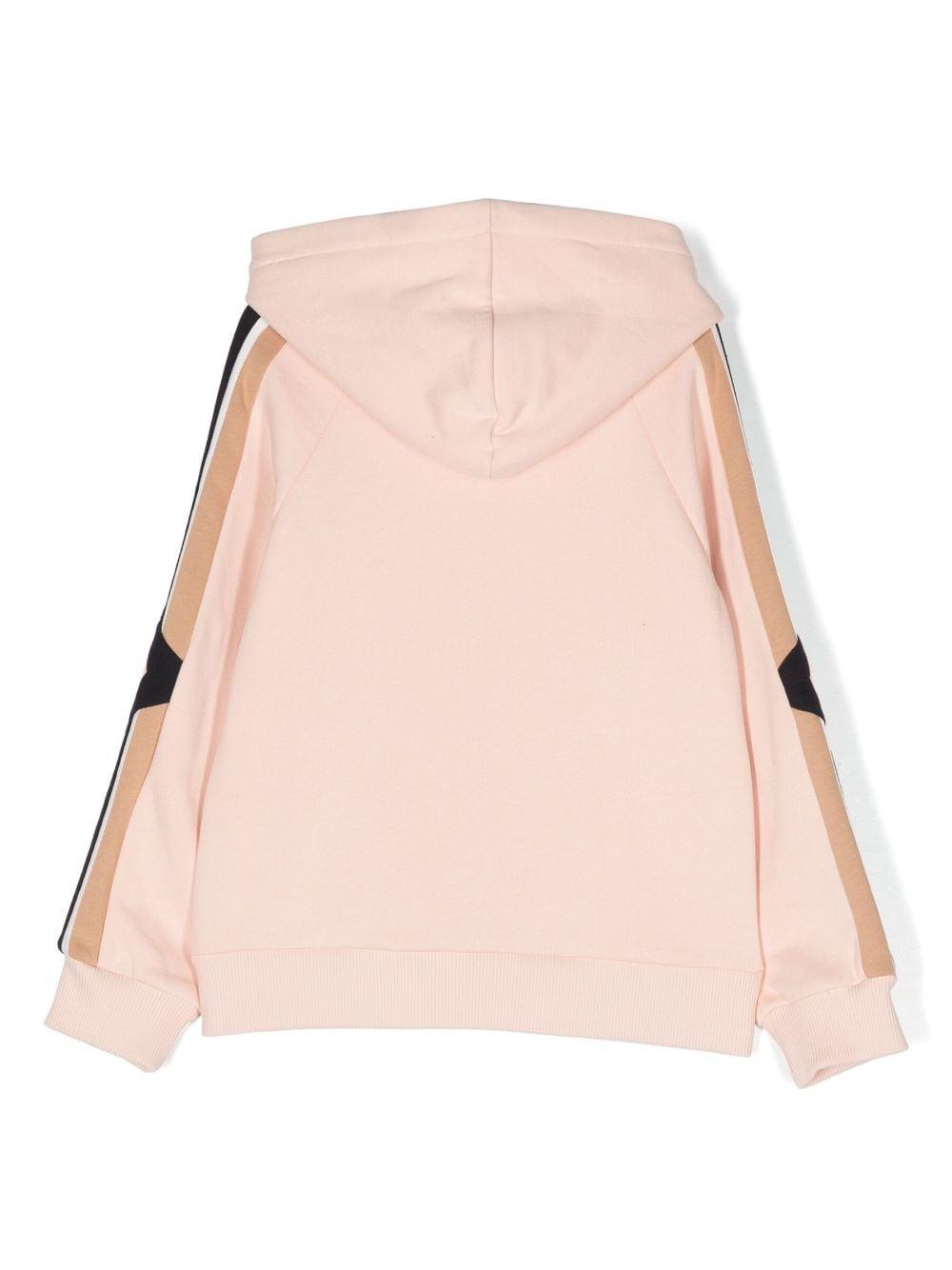 Felpa rosa bambina Chloé kids. Dettaglio laterale a righe, cappuccio con coulisse, chiusura frontale con zip, maniche lunghe, due tasche frontali a marsupio e orlo dritto. cotone 100%