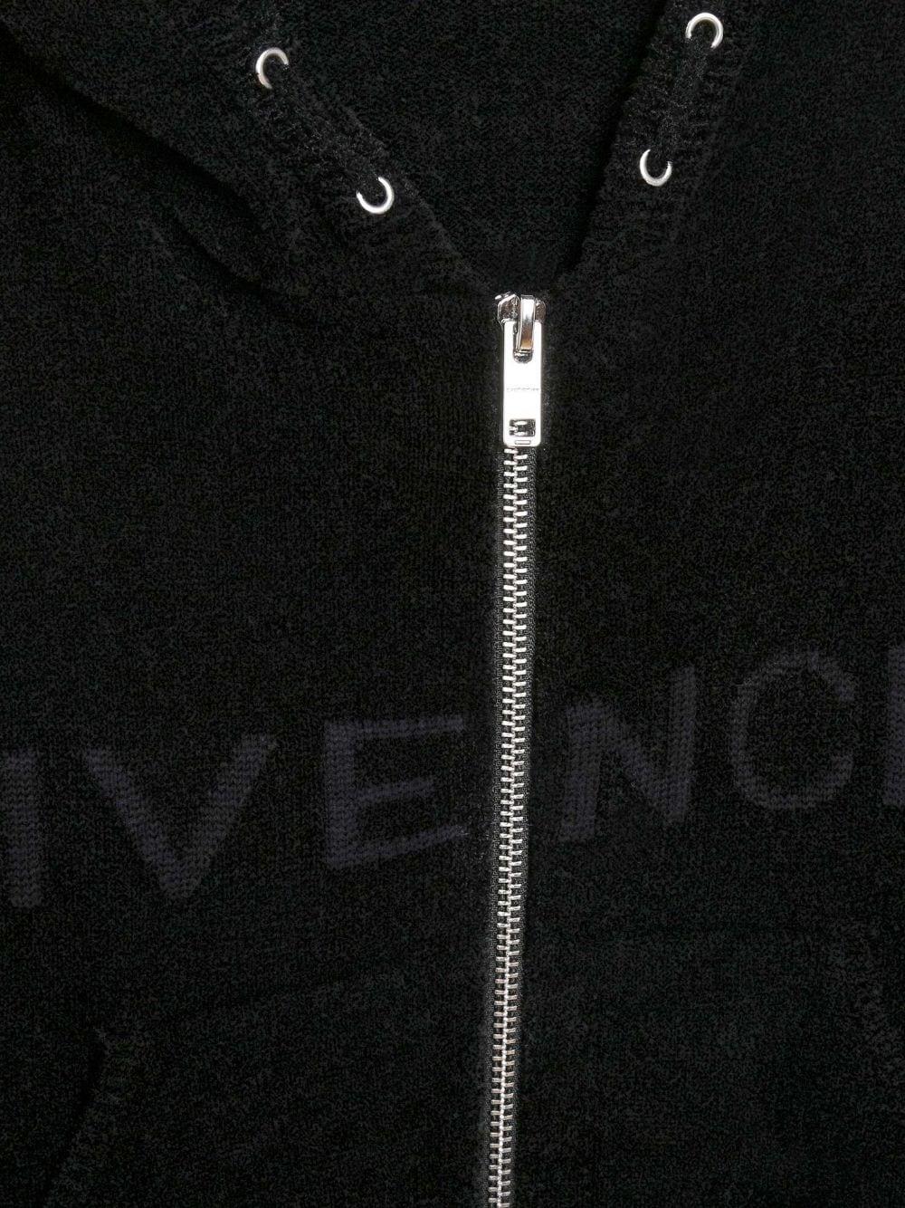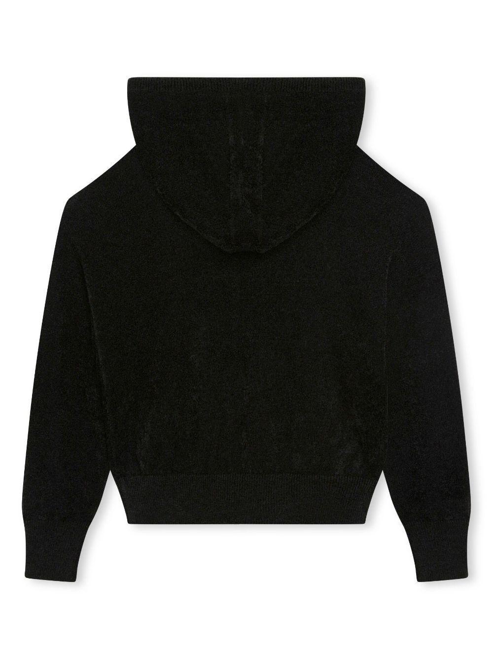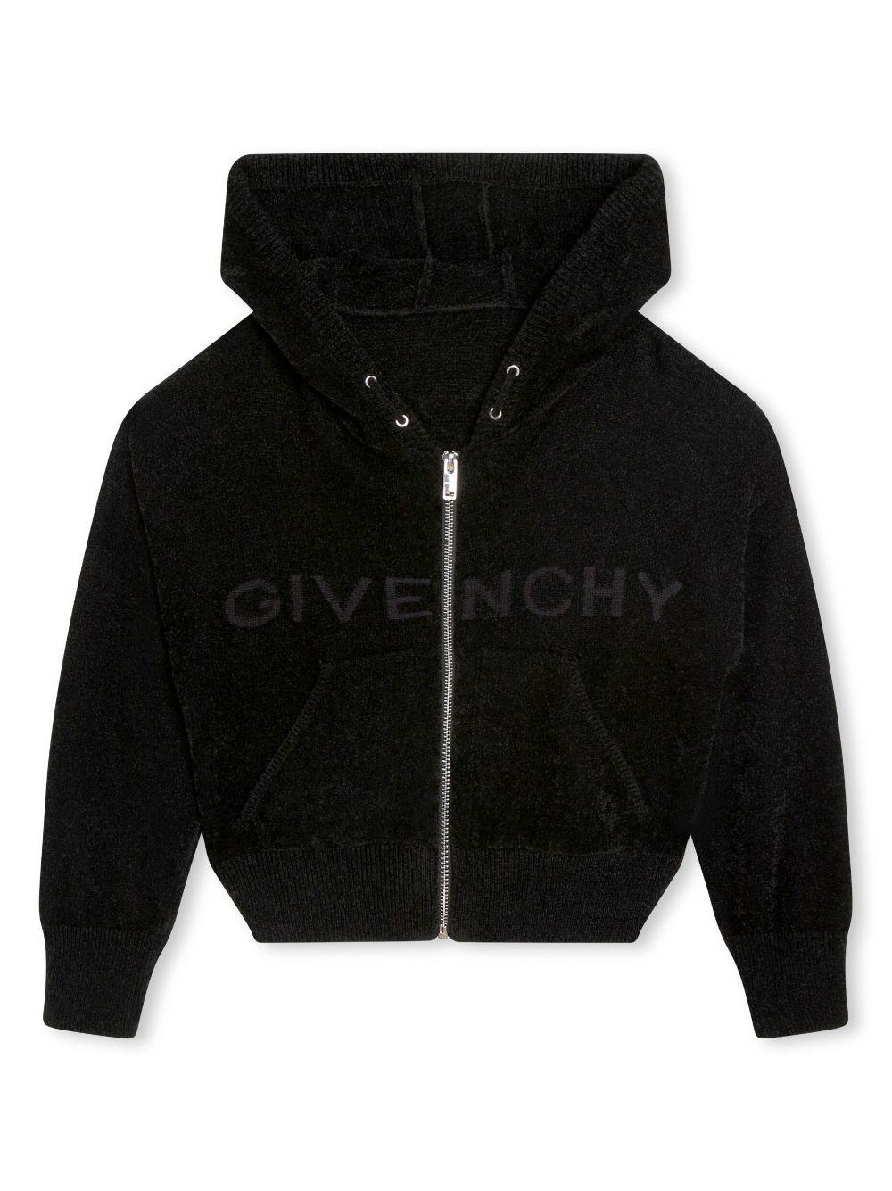 Felpa nera bambina Givenchy kids. Logo intarsiato, cappuccio, chiusura frontale con zip, maniche lunghe e orlo dritto. Poliammide 60%, Viscosa 40%