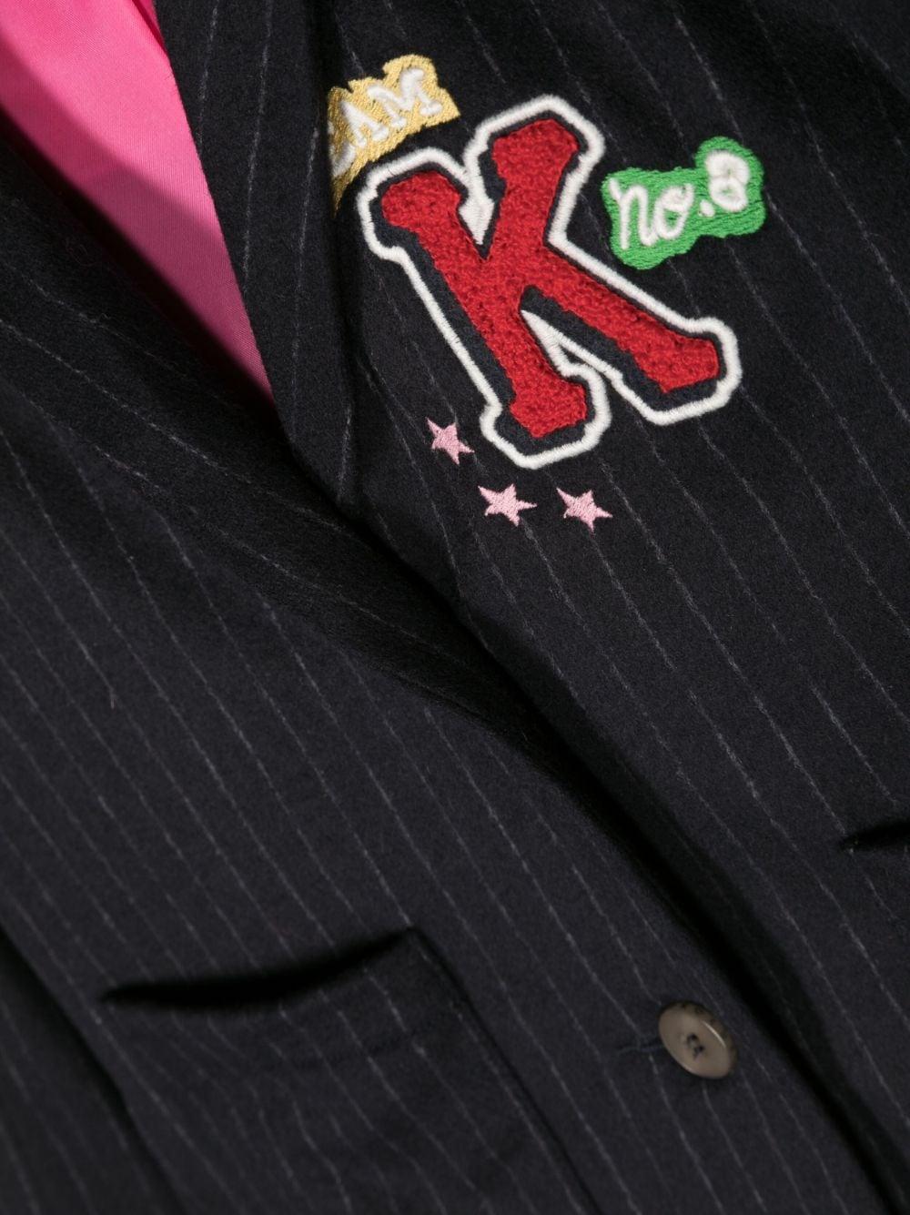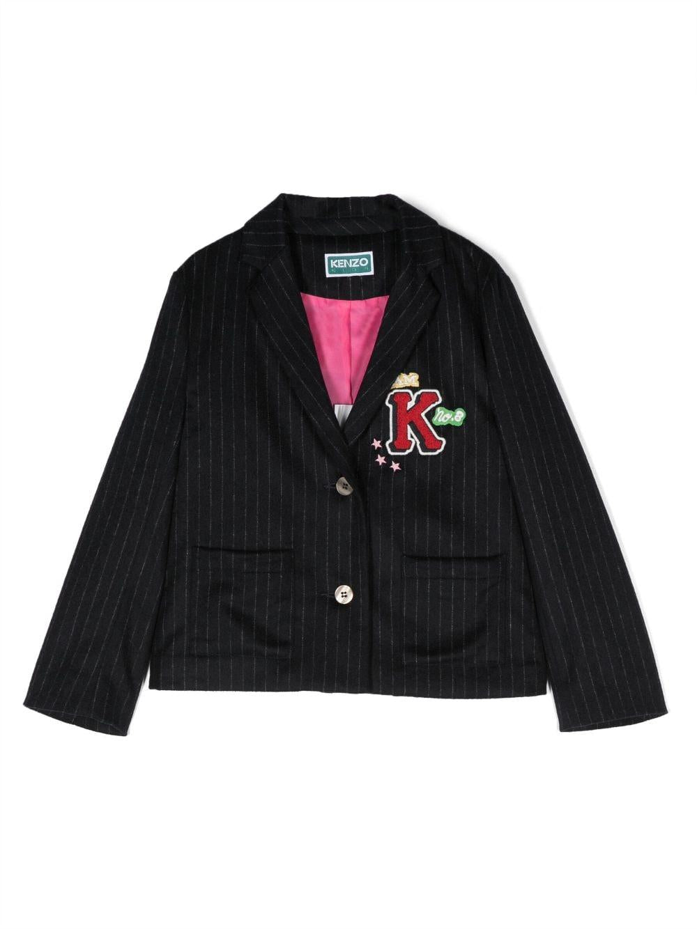 Blazer blu bambina Kenzo Kids. Motivo gessato, ricamo con logo frontale, revers classici, maniche lunghe e due tasche applicate frontali.Poliestere 100%