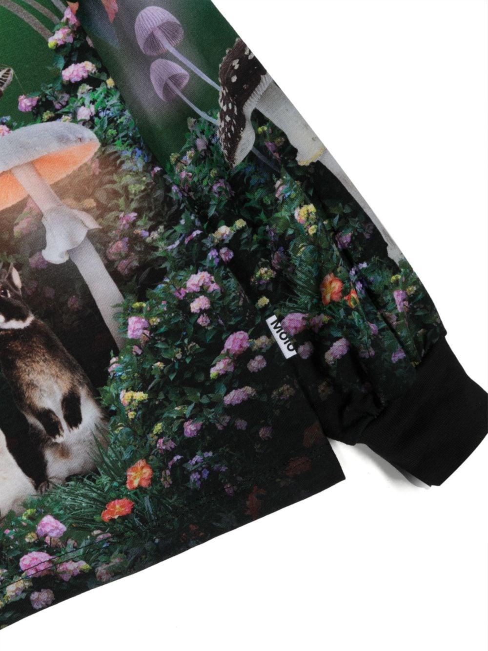 Felpa multicolor bambina, cotone biologico elasticizzato, stampa grafica all-over, applicazione laterale con logo, maniche lunghe, polsini a coste, girocollo e orlo dritto.Composizionecotone biologico 95%, elastam 5%