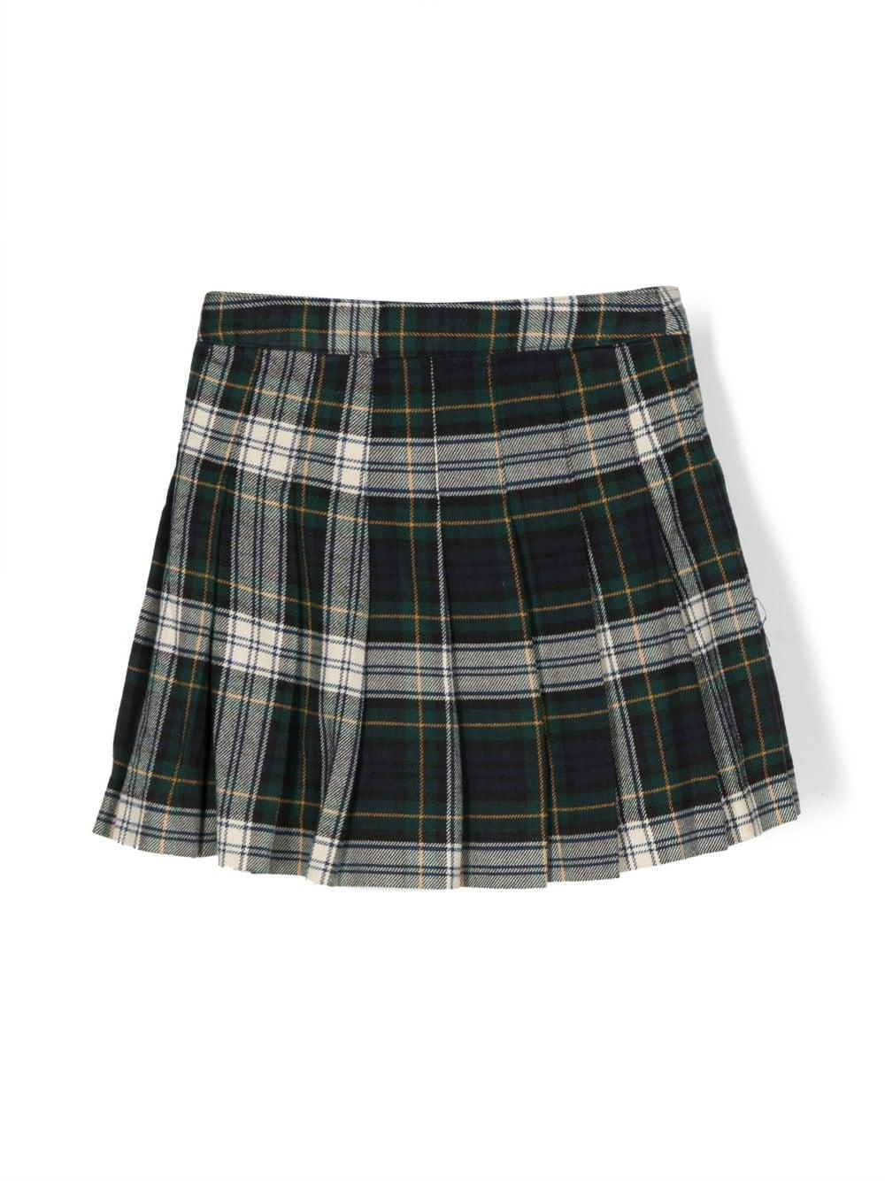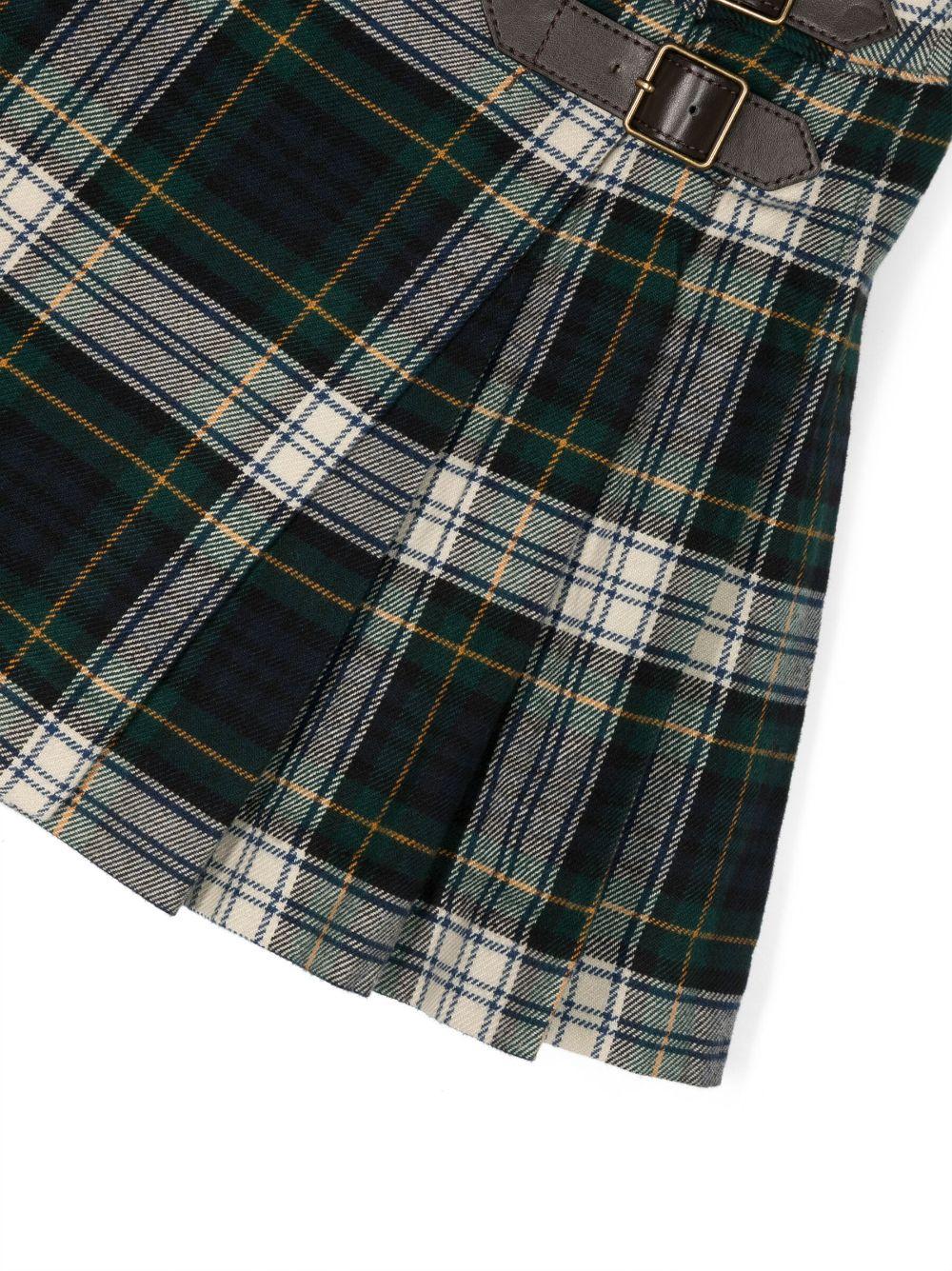 Gonna verde bambina Ralph Lauren Kids. Motivo a quadri tartan, dettaglio plissettato, vita media, chiusura laterale con fibbia e orlo dritto. Cotone 100%