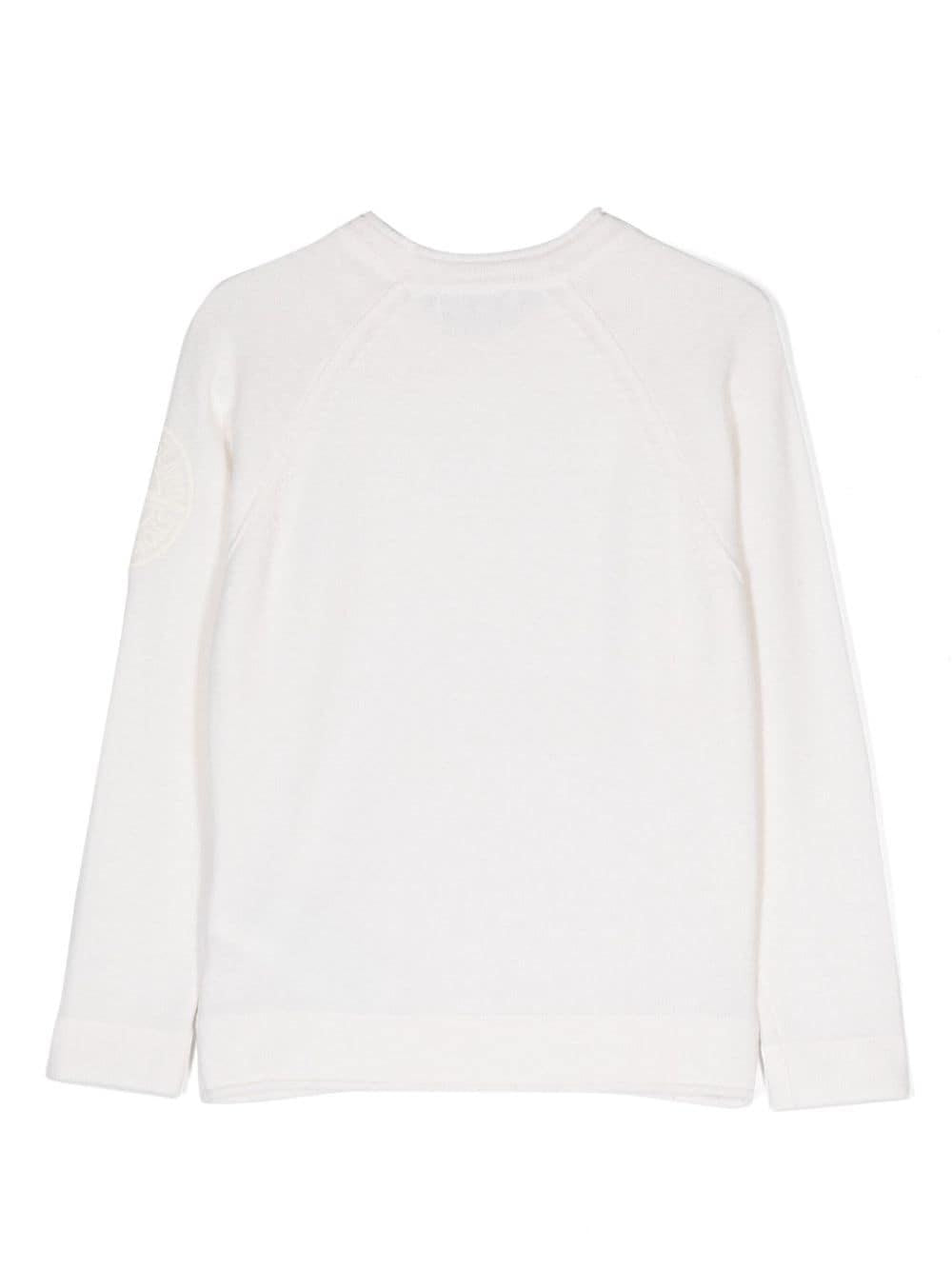 Maglione bianco bambino Stone Island Junior. Design lavorato a maglia, caratteristico motivo Compass, logo ricamato sulla manica, girocollo, maniche lunghe e orlo dritto. Lana 40%, Viscosa 30%, Poliammide 20%, Cashmere 10%