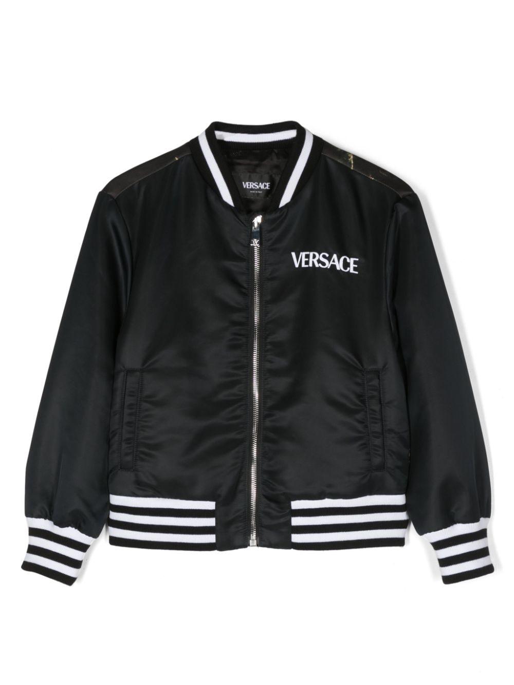 Giubbino nero bambina con stampa posteriore Versace kids logo ricamato sul petto, stampa con logo sul petto, stampa grafica sul retro, colletto a coste, chiusura frontale con zip, due tasche laterali a filetto e maniche lunghe.ComposizioneEsterno: Poliammide 100%, Poliestere 100%Fodera: Viscosa 100%, Poliestere 100%, Cotone 100%