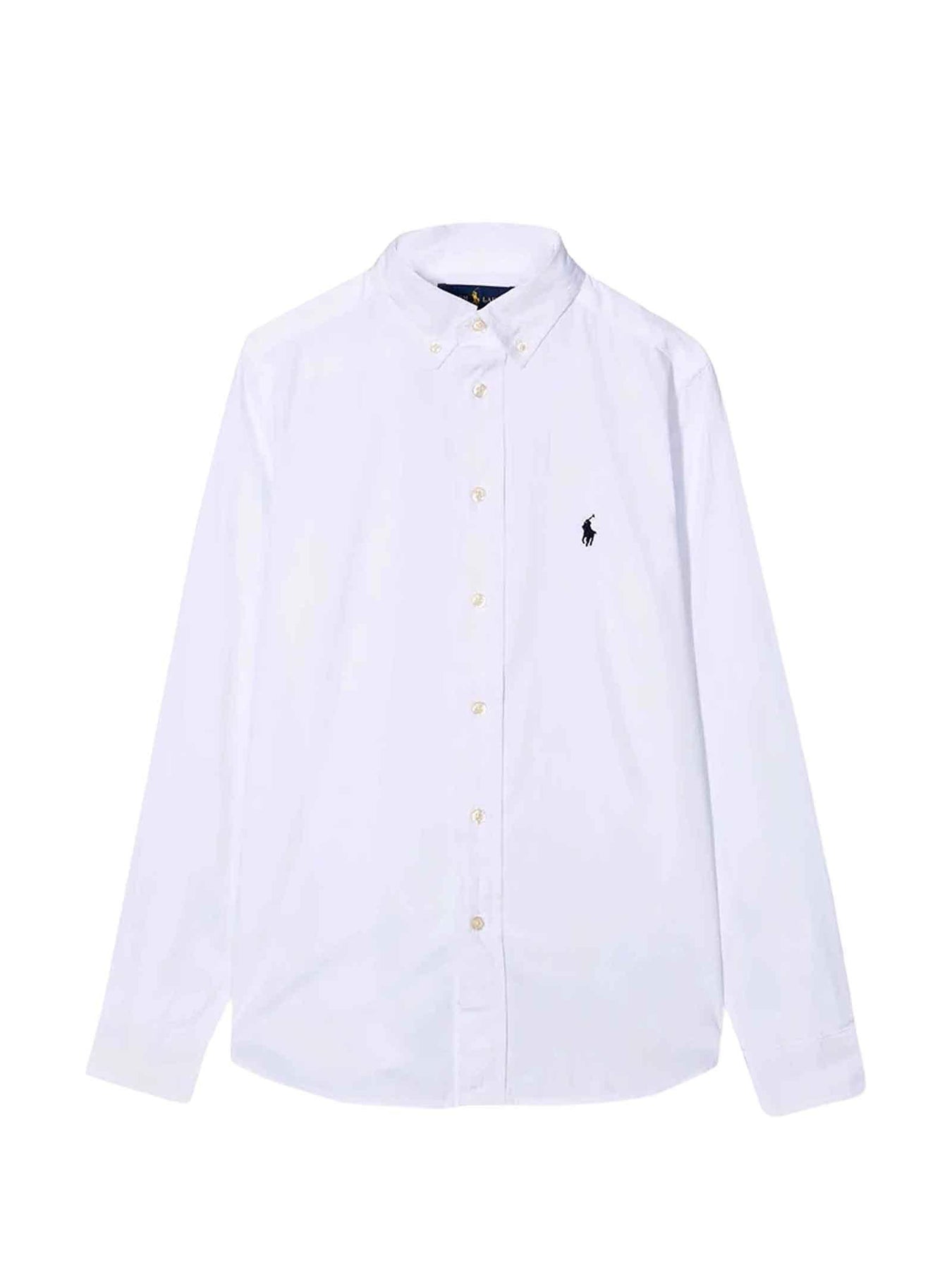 Camicia bianca bambino con ricamo, Ralph Lauren Kids, trama popeline, caratteristico motivo Polo Pony, logo ricamato sul petto, colletto button-down, chiusura frontale con bottoni, maniche lunghe, orli con bottone e orlo dritto.Composizionecotone 100%