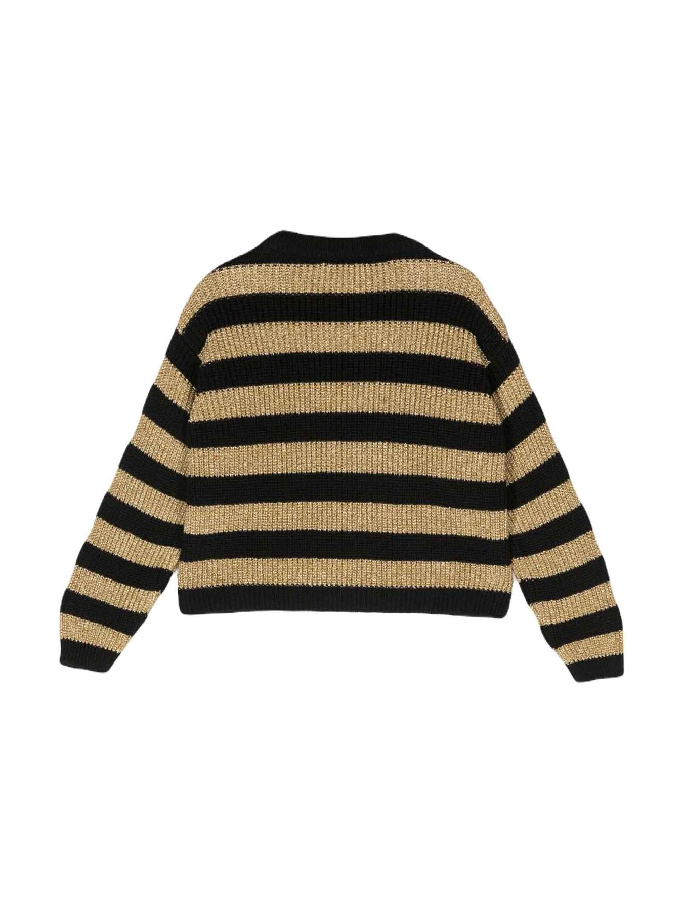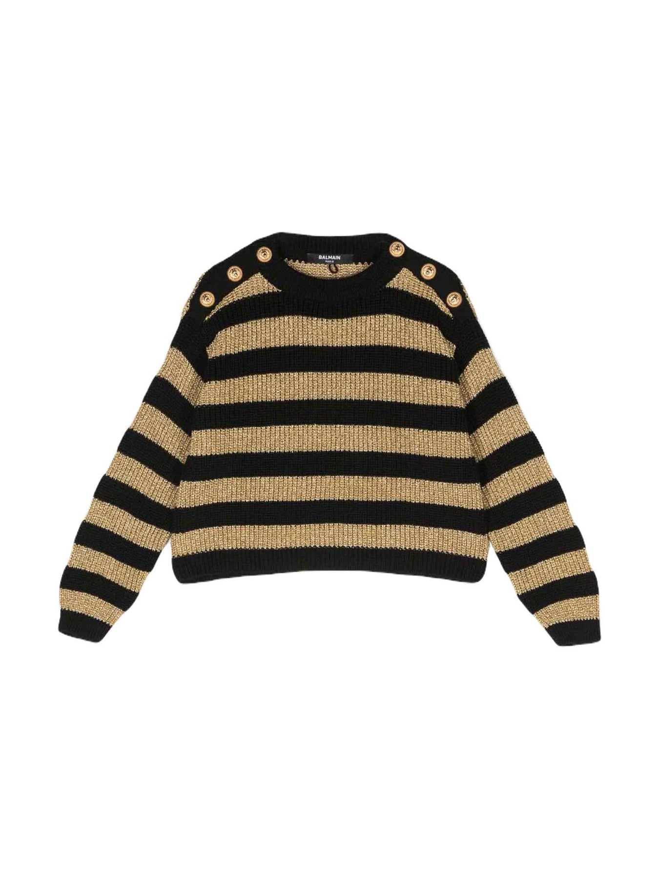 Maglia nero/oro bambina Balmain Kids. Trama metallizzata, design lavorato a maglia, motivo a righe orizzontali, girocollo, bottoni goffrati color oro, maniche lunghe e orlo dritto. Lana 60%, Viscosa 26%, Fibra Metallica 14%