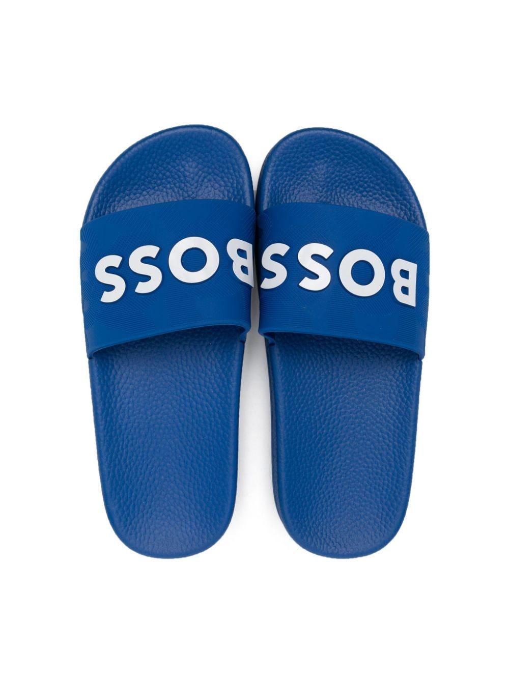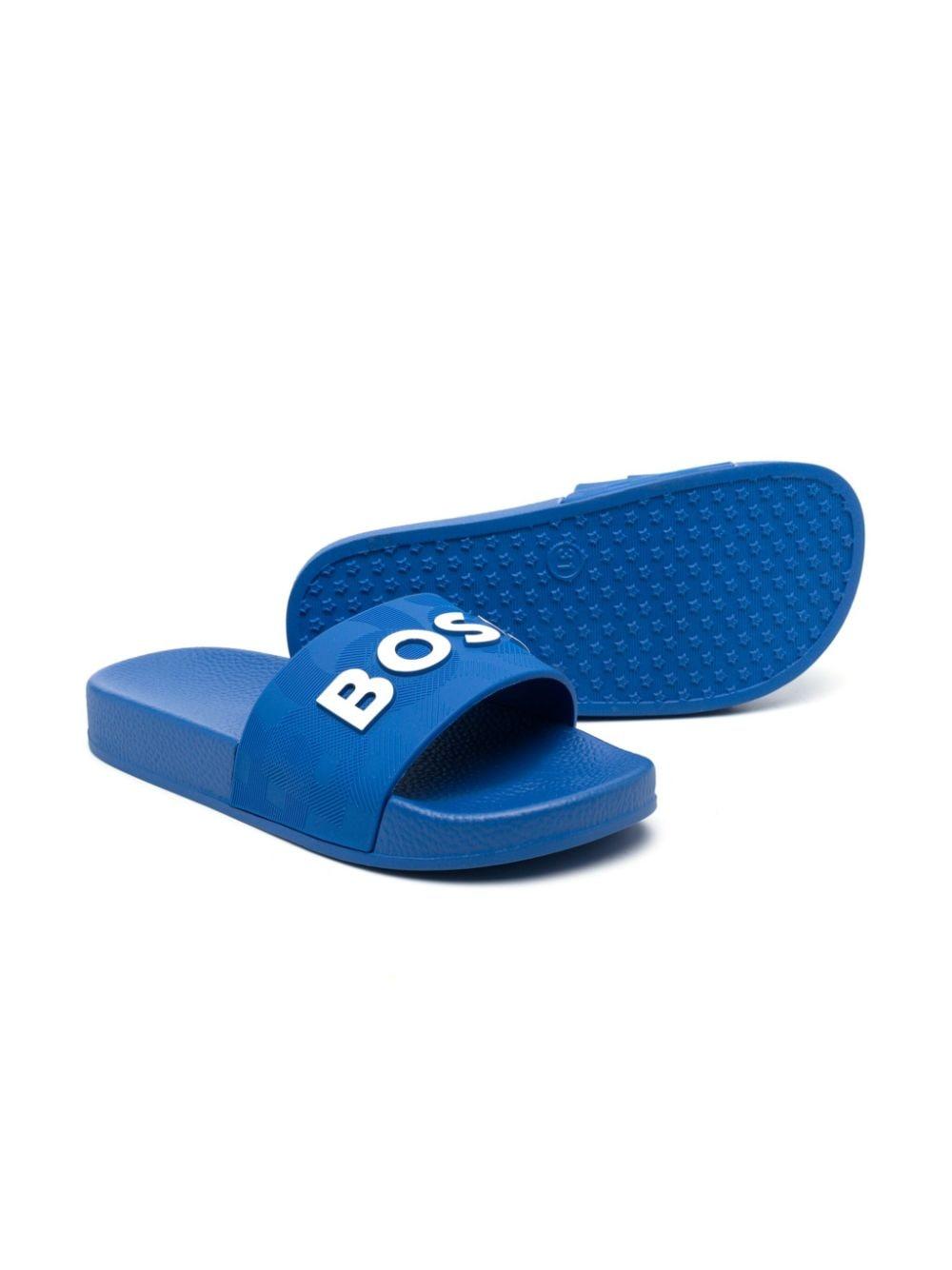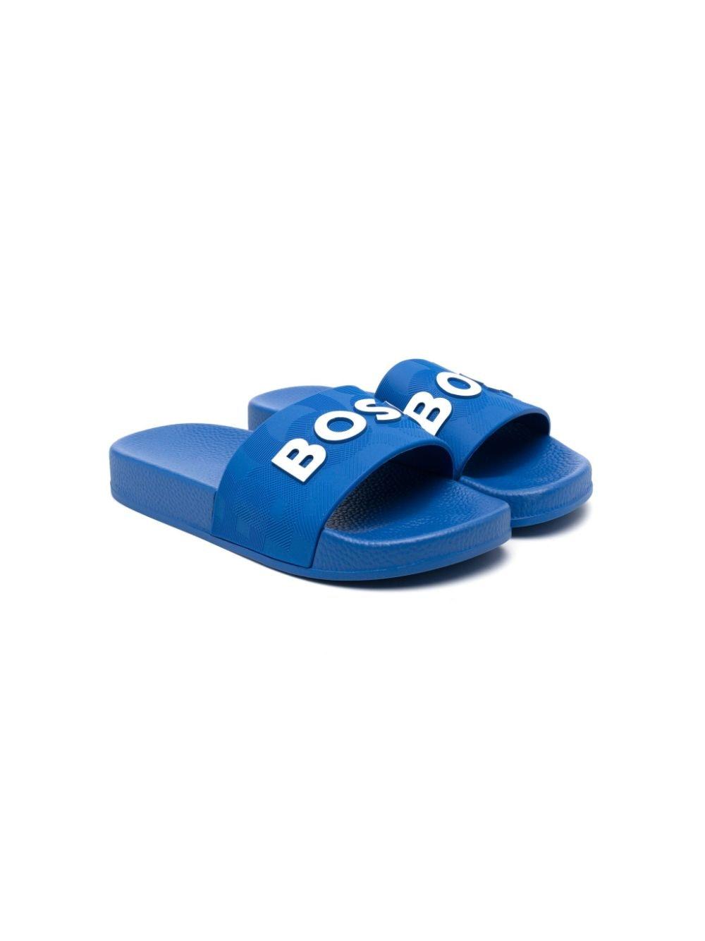 Sandali slides con logo goffrato boss kids.azzurro ,punta smussata aperta,fascia con logo goffrato,plantare sagomato,suola piatta in gomma,design slip-on.gomma 100%