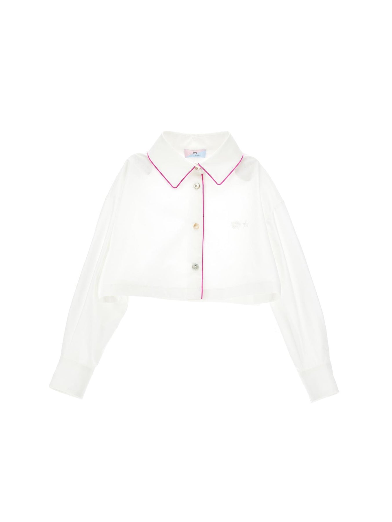 Camicia bianca con dettagli rosa bambina Chiara Ferragni kids, caratteristico motivo Eyelike, logo ricamato sul petto, bordo a contrasto, colletto classico, maniche lunghe, orli con bottone, orlo dritto e design crop.Composizionecotone 100%