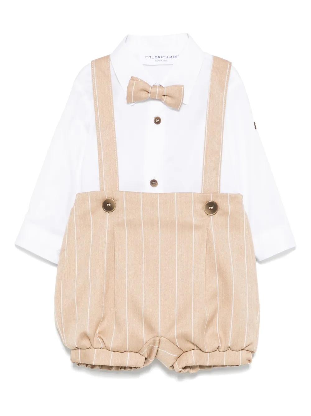 Set camicia e shorts a righe COLORICHIARI.CAMICIA:bianco,chiusura frontale con bottoni.SHORTS:vita elasticizzata sul retro,bretelle rimovibili.Papillon rimovibileEsterno: cotone 96%, elastam 4%Fodera: poliestere 65%, cotone 35%