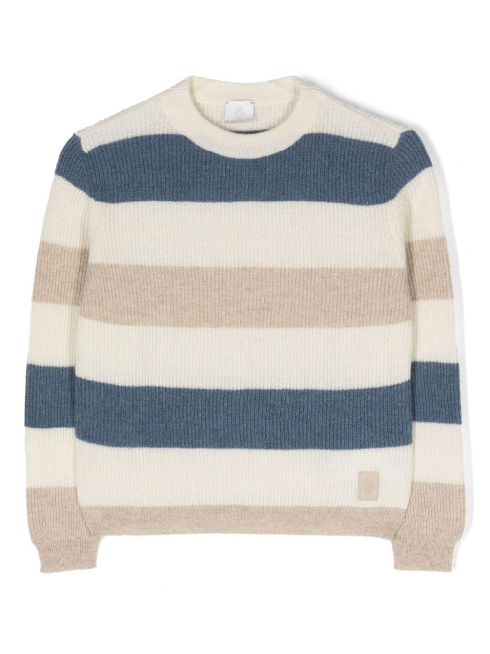 Maglione bianco/multicolor bambino Eleventy Kids. Lavorazione a intarsio, lavorazione a coste, girocollo, maniche lunghe e orlo dritto. Lana 80%, Poliammide 20%