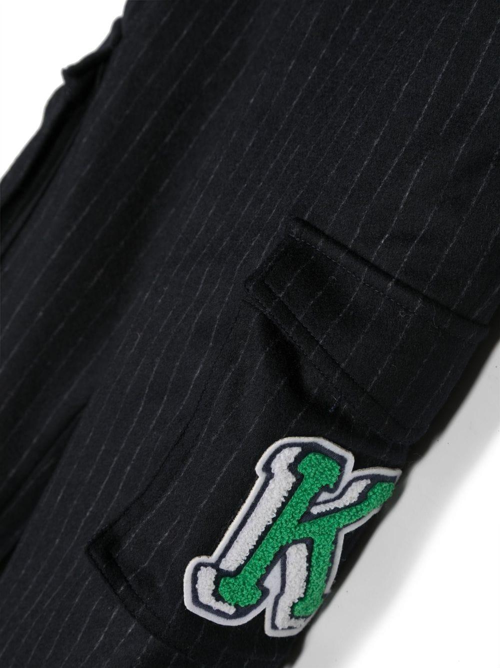 Pantaloni blu bambino Kenzo Kids. Motivo a righe verticali, applicazione laterale con logo, vita con coulisse elasticizzata, taglio straight, due tasche laterali con patta, tasca posteriore sagomata e orlo dritto.Lana 67%, Poliestere 28%, Cashmere 5%