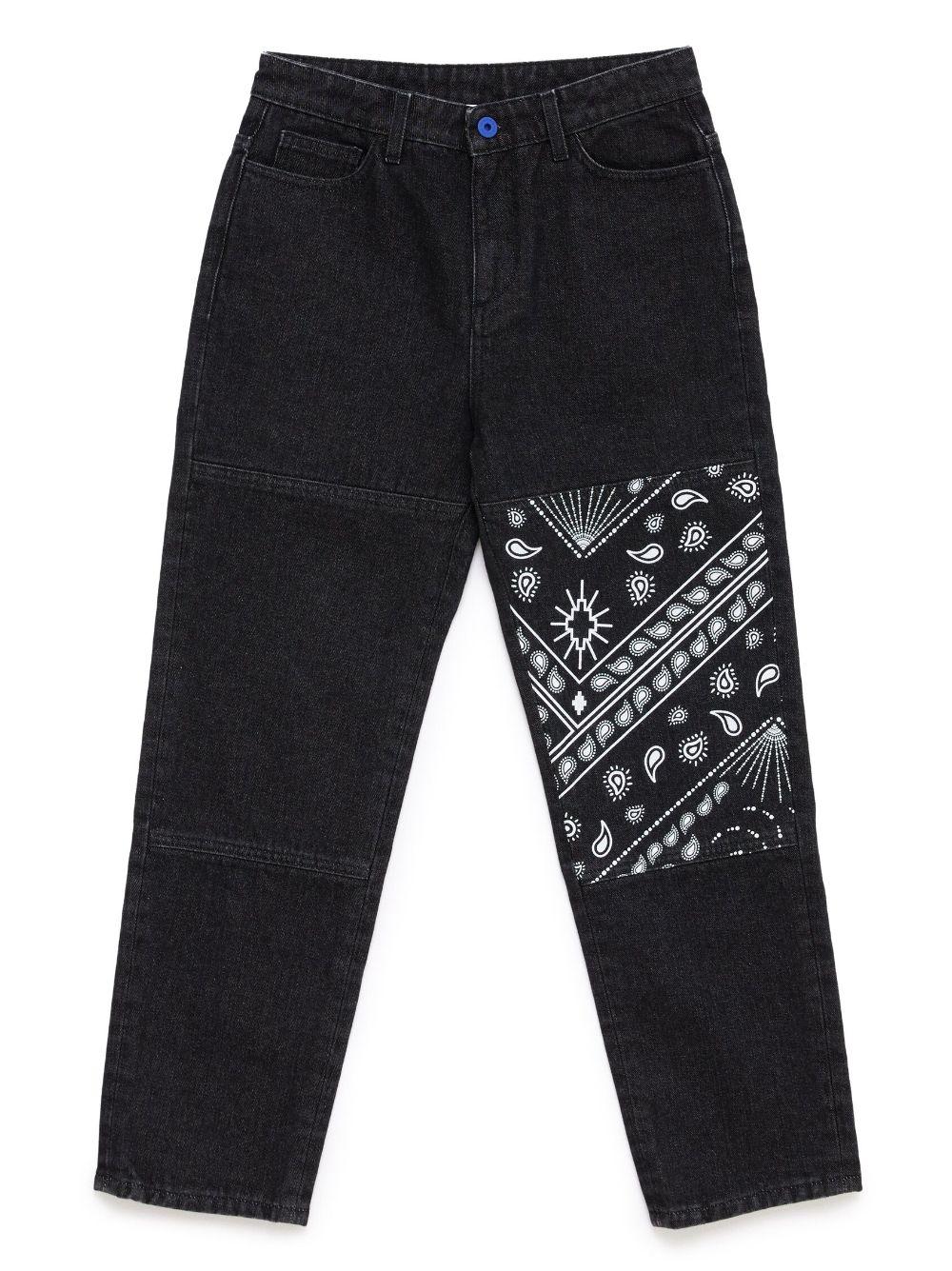 Jeans neri bambino Marcelo Burlon Kids. Stampa bandana, passanti, applicazione posteriore con logo, design classico a cinque tasche, chiusura frontale con bottoni e zip e taglio straight. Cotone 100%