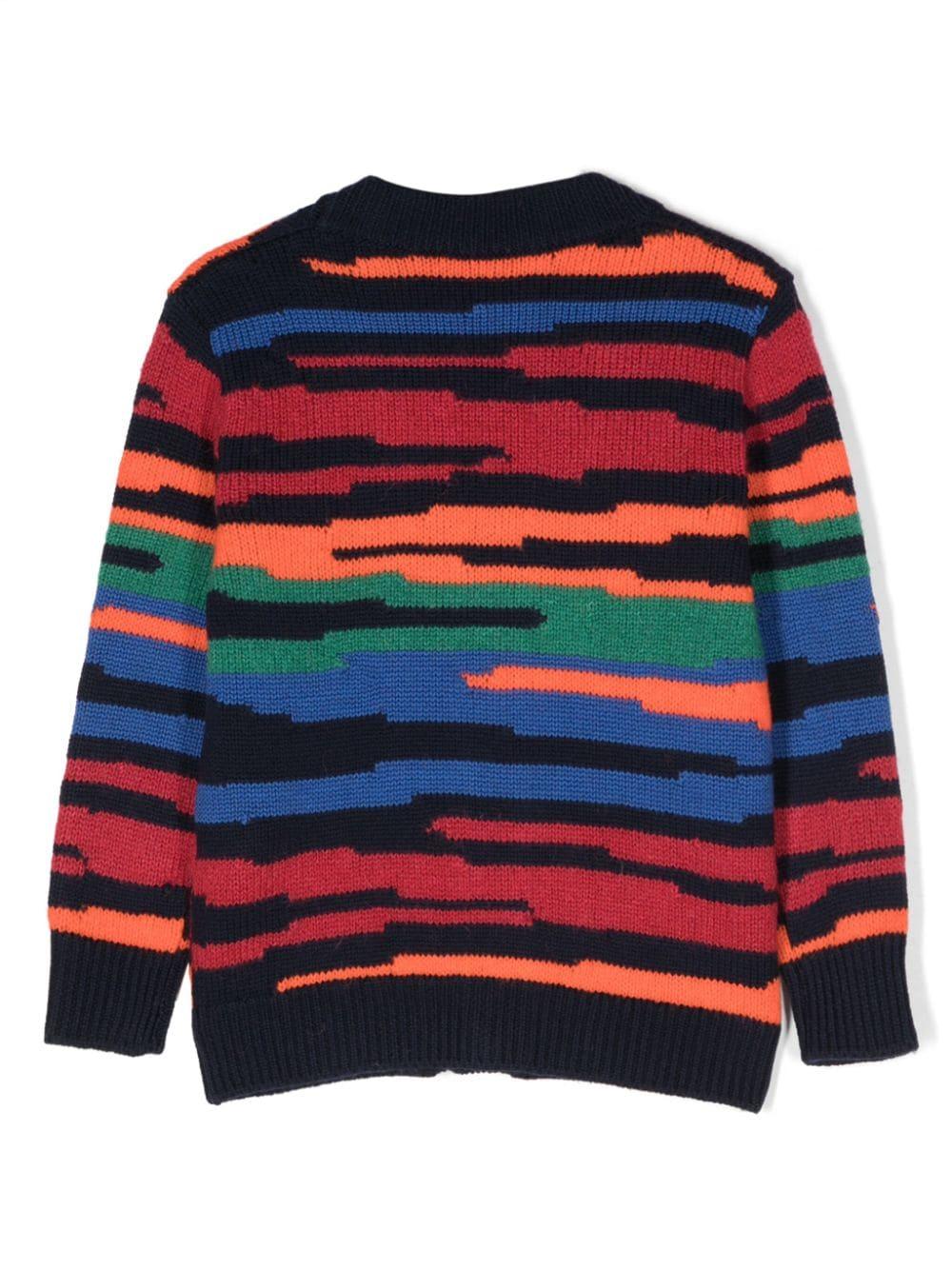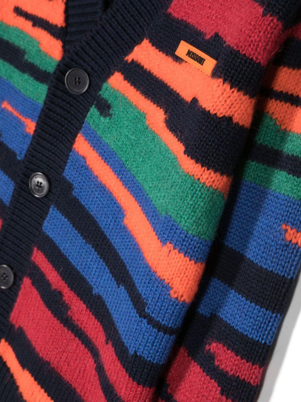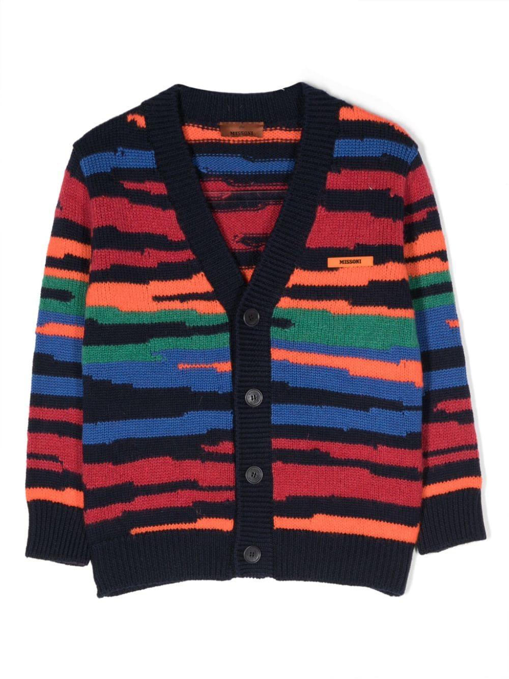 Cardigan nero/multicolor bambino Missoni Kids. Design lavorato a maglia, maglia con motivo a intarsio, applicazione con logo sul petto, scollo a V, chiusura frontale con bottoni, maniche lunghe e orlo dritto. Lana 63%, Acrilico 14%, Poliammide 12%, Mohair 11%